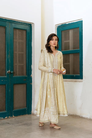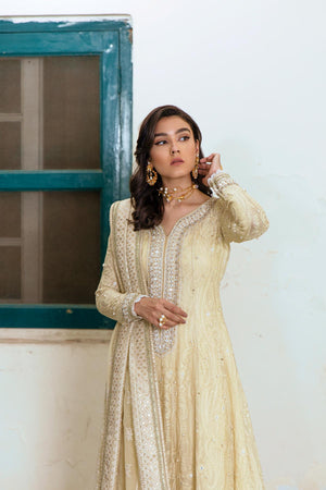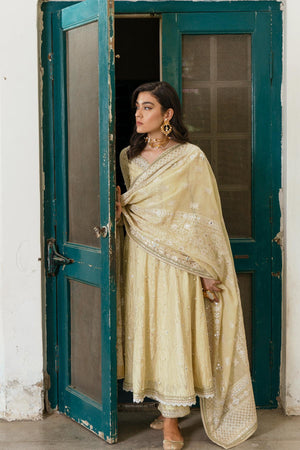 This outfit is specially made from cotton net to make you stand out! It features a detailed hand embellished neckline and sleeves with intricate sheesha work and a tasteful array of lace and pattis on the ghera of the dress. It comes with finely embroidered Korean silk culottes to complete the vision of grace.Collection: Parizaad, Eid Collection'21