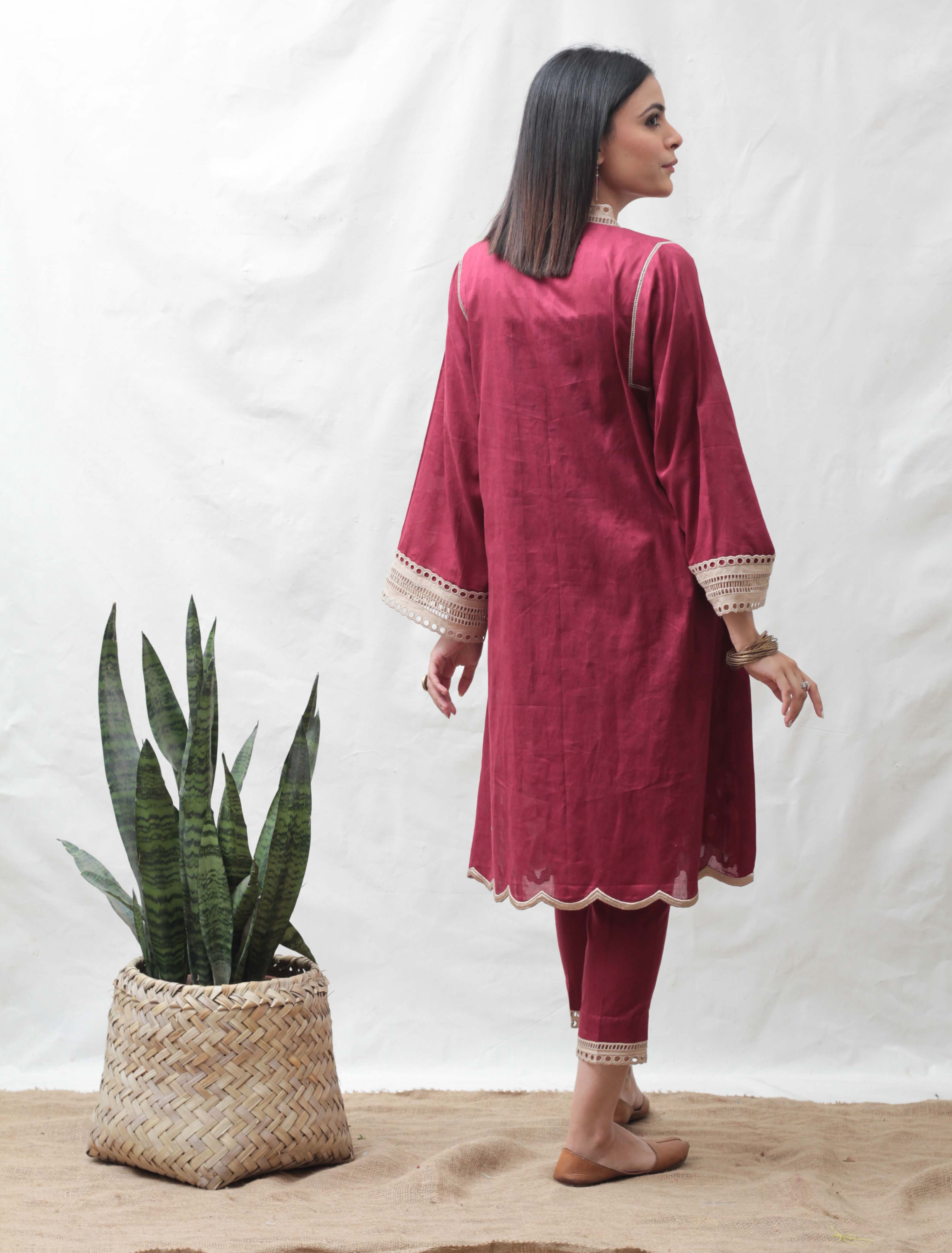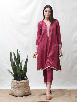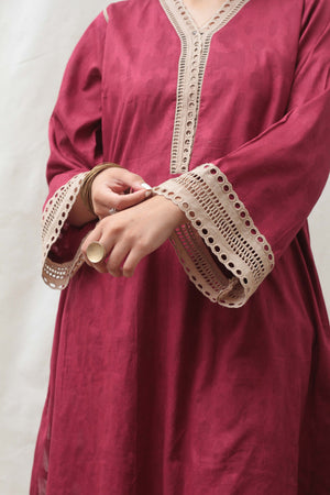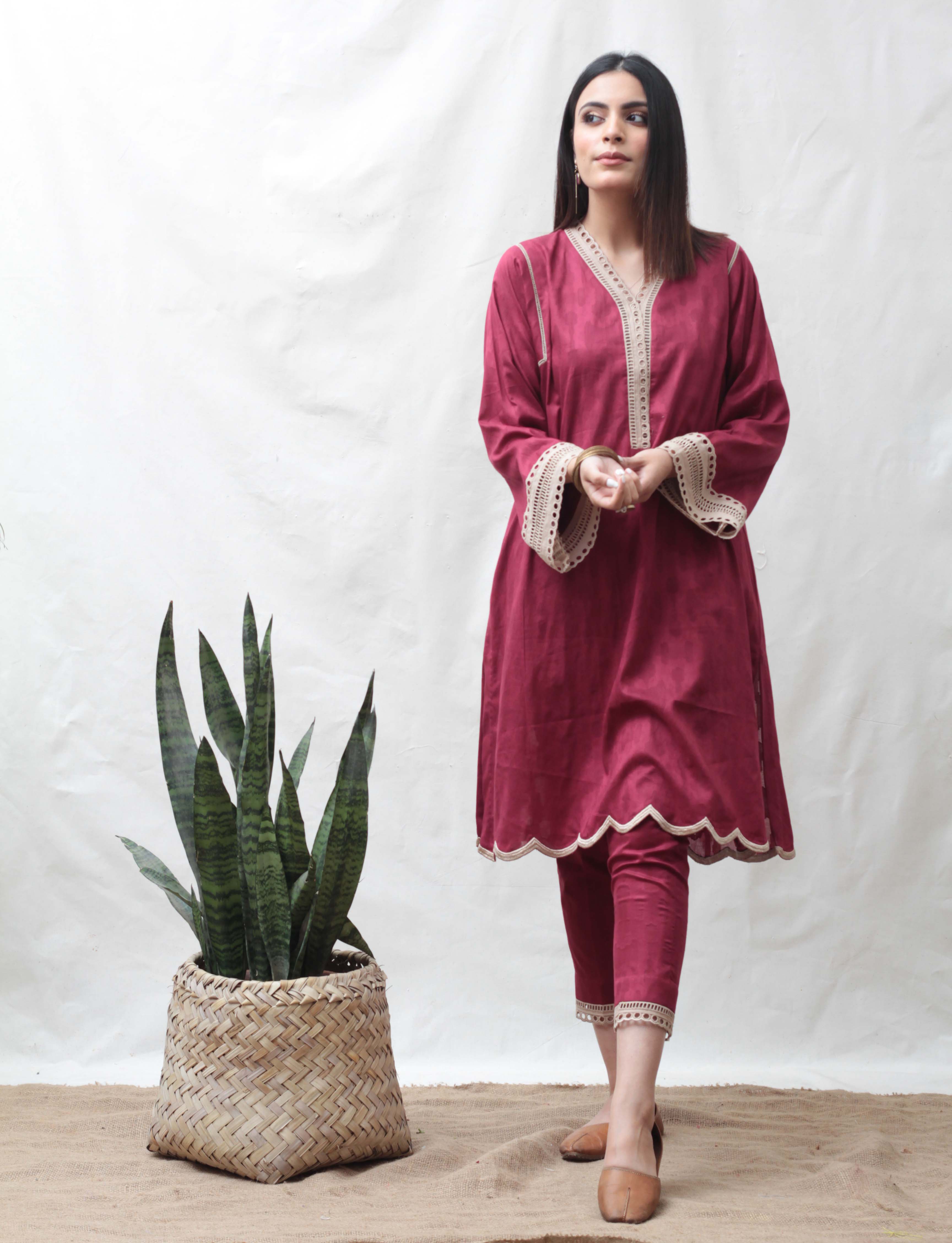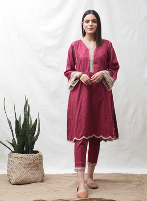 A maroon self broshia shirt, with beige chicken used on the neck and sleeves and the pants, with hand embroidered scallops.