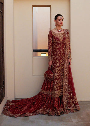Zinia from the Maysa Bridal Couture '24 collection—a true masterpiece of traditional elegance. This deep red dress features a long shirt, adorned with purely handcrafted embellishments that highlight the artistry of skilled craftsmanship. Intricate beadwork, shimmering sequins, and delicate embroidery create a timelessly regal look, making every detail a work of art. Paired with a flowing farshi gharara, the voluminous flare and intricate detailing elevate the grandeur of the outfit, perfectly embodying the essence of classic bridal fashion. The ensemble is completed with a breathtaking dupatta, framed by a meticulously embroidered four-sided border. The dupatta’s heavily embellished pallu, adorned with ornate patterns and rich embellishments, serves as the perfect focal point. Zinia is the ideal choice for a bride who seeks a harmonious blend of heritage, luxury, and timeless beauty.