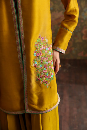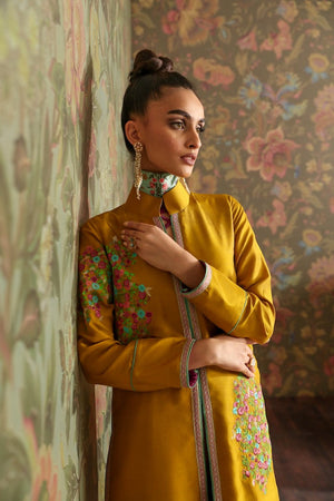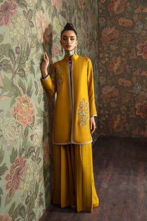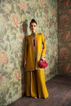 A stunning mustard-colored mid-length jacket with floral embroidery and fitted sleeves with printed finishings. Paired with a bustier (slip can be made). Completed with the same colored flared pleated pants.