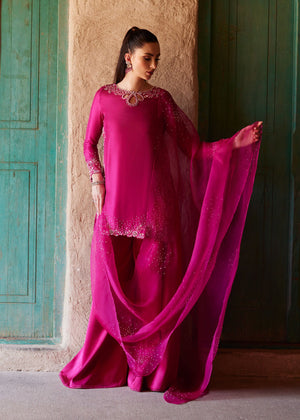 A striking shocking pink ensemble crafted from pure raw silk, adorned with intricate Ada handwork and precise machine embroidery along the sleeves, hemline (daaman), and neckline. The outfit is paired with Indian charmeuse fused flared sharara pants, adding movement and elegance, and is completed with a flowy medium organza dupatta featuring an all-over Ada spray embellishment, creating a vibrant and meticulously detailed look perfect for formal occasions.