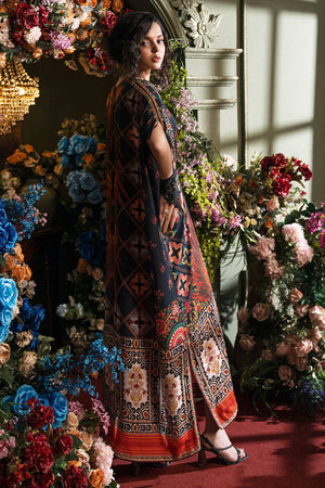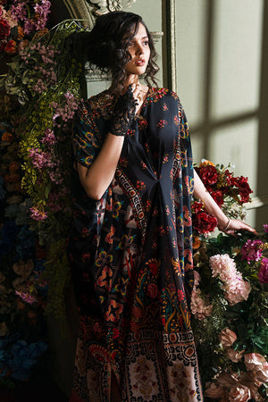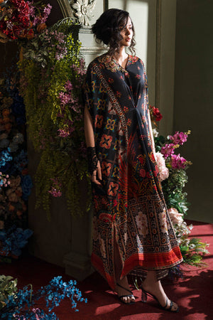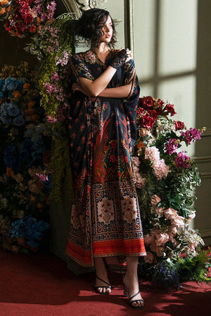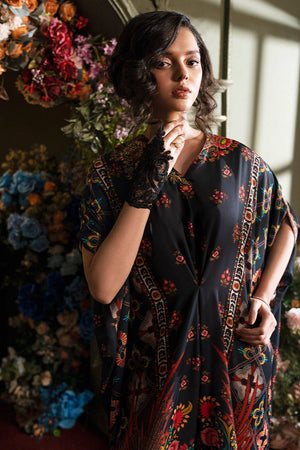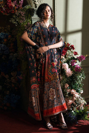 A stunning navy blue floral digital printed kaftan with embellished motif on neckline, completed with beautiful colorful border.