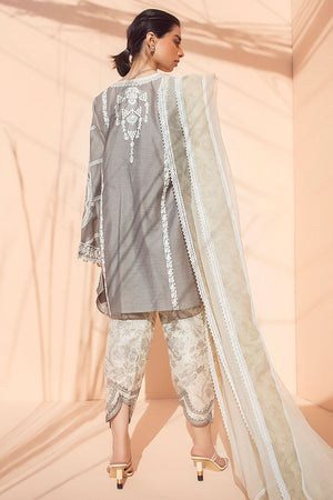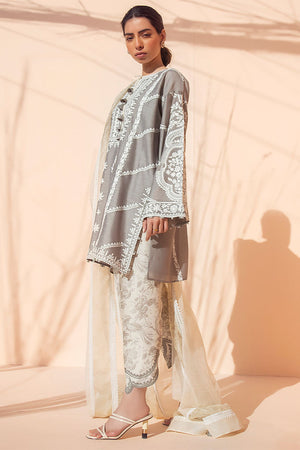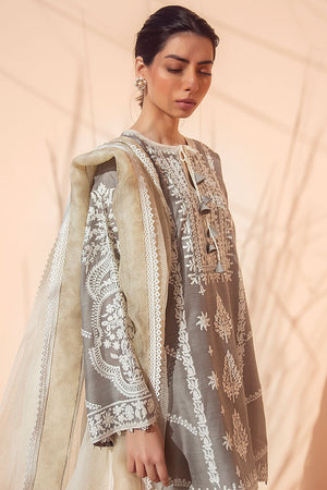 Stone grey sets the canvas for this light and airy khaddi silk shirt with cream Aari embroidery and tassel detailing. The outfit is paired with raw silk printed Panwar and a woven dupatta with a printed border. The piece is a cohesive and versatile outfit for any occasion.