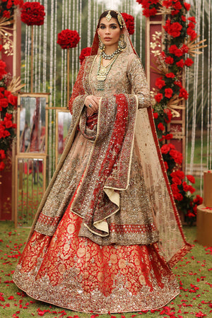 This statement look is a must have for brides this season. This has higly intrecate skillied craftmen work of Naqshi, Dabka, Kora and seaquance work on cotton net fabrics, paired with a zaree Jamawar lengha with a heavily embellished boarder to complete the look. Two regal dupatta are added.