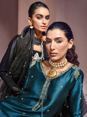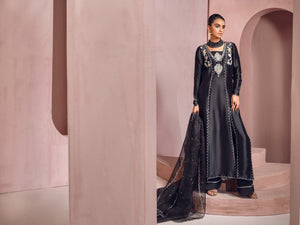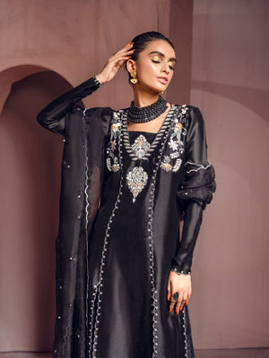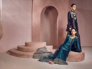 An elegant tapestry is created at the neckline with silver and pastel color handwork. This style is designed with ultra-feminine twists, heightened textures, and luxurious embellishments to ease your way through the festive season.