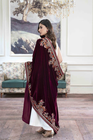 Modern or traditional, acquire an enticing look by adding this alluring and luxurious maroon velvet shawl adorned with intricate embroidery and tilla finishing, leaving an unforgettable impression.