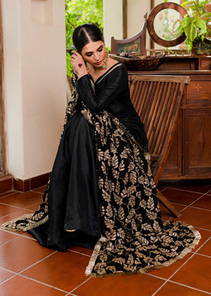 The ageless black gharara set with a contemporary designed neck. Statement dupatta is detailed to perfection & special details on borders. A perfect attire for this festive season. A matching potli bag is added for you to stay from head to toe in Allure!