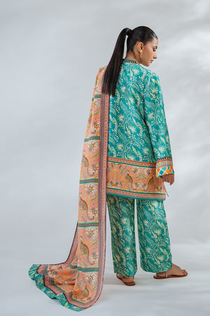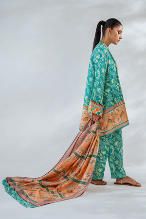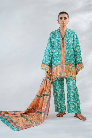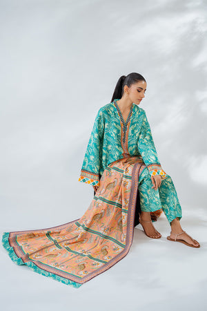 An aqua hued pure rawsilk set imitates the ambience of a floral garden. The effortless printed set is paired with a contrasting peach medium silk dupatta, decorated with a tropical print celebrating wildlife.