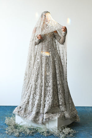 A sublime bone hued tulle peshwas is intricately handcrafted with an amalgamation of bird figurines and floral motifs in aari, zardoze and resham work. The hand embroidery continues on the heavily embroidered dupatta cut from tulle with added 3D floral petals and sequin details. A voluminous tulle and tissue brocade lehnga is detailed with peacocks and floral bouquets handcrafted with aari, resham, and zardoze for a bridal look that is timeless.