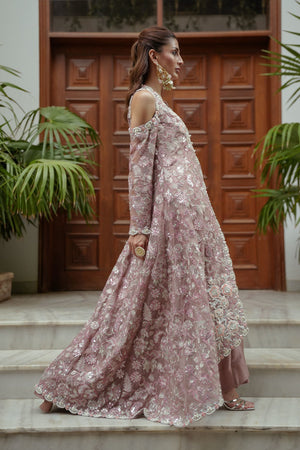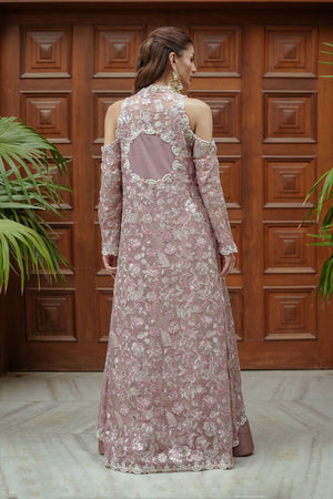 This outfit is an elegant traditional ensemble with a modern twist. Long front-open jacket style over a matching inner dress and wide-leg pants. The jacket is made of sheer chiffon fabric with heavy floral embroidery, and the inner and pants are crafted from a solid silk fabric in a matching dusty pink tone. Jacket features cold-shoulder cutouts, long sleeves, and an asymmetrical hemline that curves elegantly at the front. Dense floral motifs with silver sequins, zari work, and thread embroidery, especially concentrated at the borders and hem. Overall look is regal, sophisticated, and perfect for formal events like weddings or receptions, blending traditional embroidery with contemporary styling.