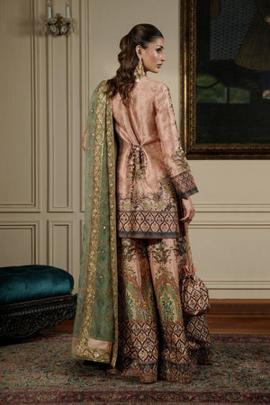This outfit is a stunning traditional bridal or formal ensemble with rich embellishments and regal tones. Classic short shirt paired with a heavily embellished dacca pants and a coordinating dupatta. Luxurious raw silk for the shirt and dacca pants, with a sheer dupatta featuring embroidered borders. The outfit is of soft peachy pink with deep navy blue borders, rich green motifs, and gold zari detailing. It has intricate embroidery on the neckline, sleeves, and hem with shimmering sequins, zardozi work, and colored threadwork. It is paired with flared dacca pants style with ornate patterns in green and gold, highlighted with sequins, beads, and thread embroidery. Wide contrasting hem border with elaborate motifs and jewel-toned detailing. Dupatta is light green with a golden embroidered border and delicate motifs scattered throughout. A regal, traditional outfit with Mughal-inspired patterns and a rich color combination, ideal for weddings or high-end festive events. Potli bag can be added seperately.