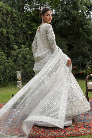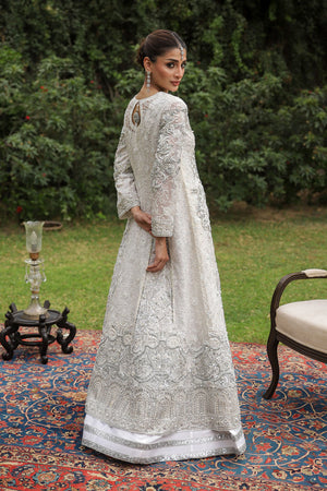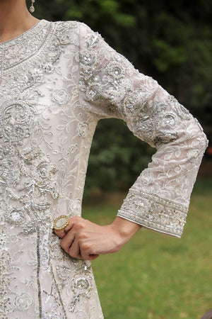 This outfit is a luxurious formal bridal ensemble, most likely meant for a walima (wedding reception) or engagement. The silhouette is long, flowing, and regal – resembling a peshwas or a floor-length kameez with a panelled flare, worn over a structured inner frock. Embellished with silver and metallic threadwork. Accents of mirror-like sequins, beading, and pearls for added shimmer. Sheer organza sleeves and net dupatta. Dense silver embroidery in floral and traditional motifs and heavy use of zardozi, tilla, naqshi, dabka, and crystal embellishments. Scalloped or beaded hemline with fine finishing. Dupatta features a polka-dot sequin pattern with a heavily embroidered border. Can be paired with a round embellished potli bag, matching the outfit in color and details. This ensemble gives off a sophisticated, ethereal, and regal aura. Perfect for Walima (reception), Engagement / Nikkah ceremony & couture events.