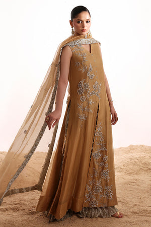 A regal Golden Indian Tissue ensemble featuring a finely crafted shirt with a matching dupatta and a graceful tissue sharara. A luxurious design that radiates timeless charm.