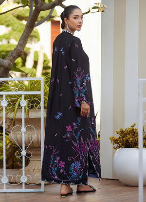 Cut from black luxurious raw silk, this embroidered kaftan-style shirt defines understated glamour. The neckline is delicately embellished with pearls, adding a touch of refined sparkle, while contrasting finishing details offer a bold, contemporary edge. Botanical motifs in vibrant hues adorn the whole shirt, making it perfect for any manner of festivity. Paired with sleek raw silk pants, this ensemble is the perfect blend of relaxed sophistication and timeless style—ideal for festive gatherings or elevated everyday wear.