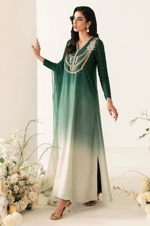 This Kaftan comes in attuning green umbra shades the intricate hand work of rasham, beads, sequins, dabka and seroski makes it a true work of art. This kaftan can be worn in a variety of ways to suit your personal style. To complete the look. It is paired with pure organza dupatta that also has ombre effect with sequins spray.