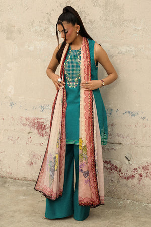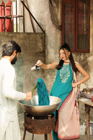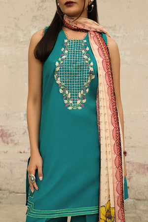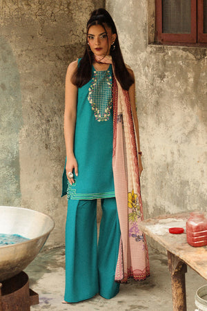 Description: Step into elegance with this 3-piece ferozi green set featuring an embroidered cambric halter shirt, detailed farshi shalwar, and a printed chiffon dupatta. Delicate lace inserts and a scalloped hemline add a refined touch to this breezy, graceful outfit