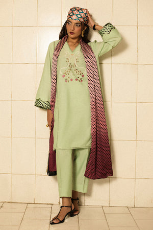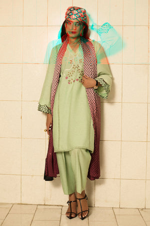 Description: Refresh your look with this 3-piece pistachio set featuring a cambric V-neck shirt with flared scalloped sleeves, and matching loose-fit trousers. A printed chimose silk dupatta and delicate lace inserts complete the effortlessly chic ensemble.