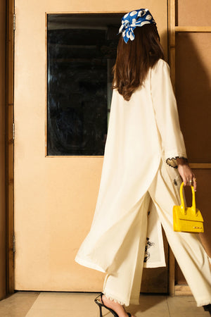 Description: Timeless and graceful, this off-white cambric set showcases a knee-length shirt with floral embroidery, loop button detailing, and flared sleeves with contrast edging. Paired with straight-fit trousers featuring frayed edges, it blends subtle charm with contemporary style.