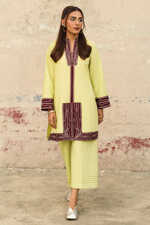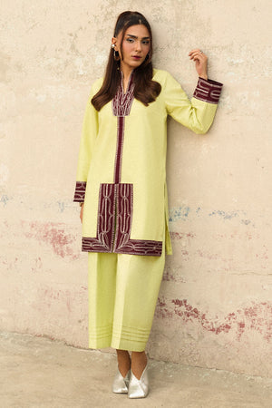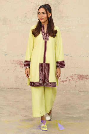 Description: Bright and breezy, this lemon yellow lawn cotton set features a mid-thigh shirt with embroidered borders and a stylish front slit. Finished with pleated culottes and contrast embroidered sleeve accents, it's a fresh take on everyday elegance.